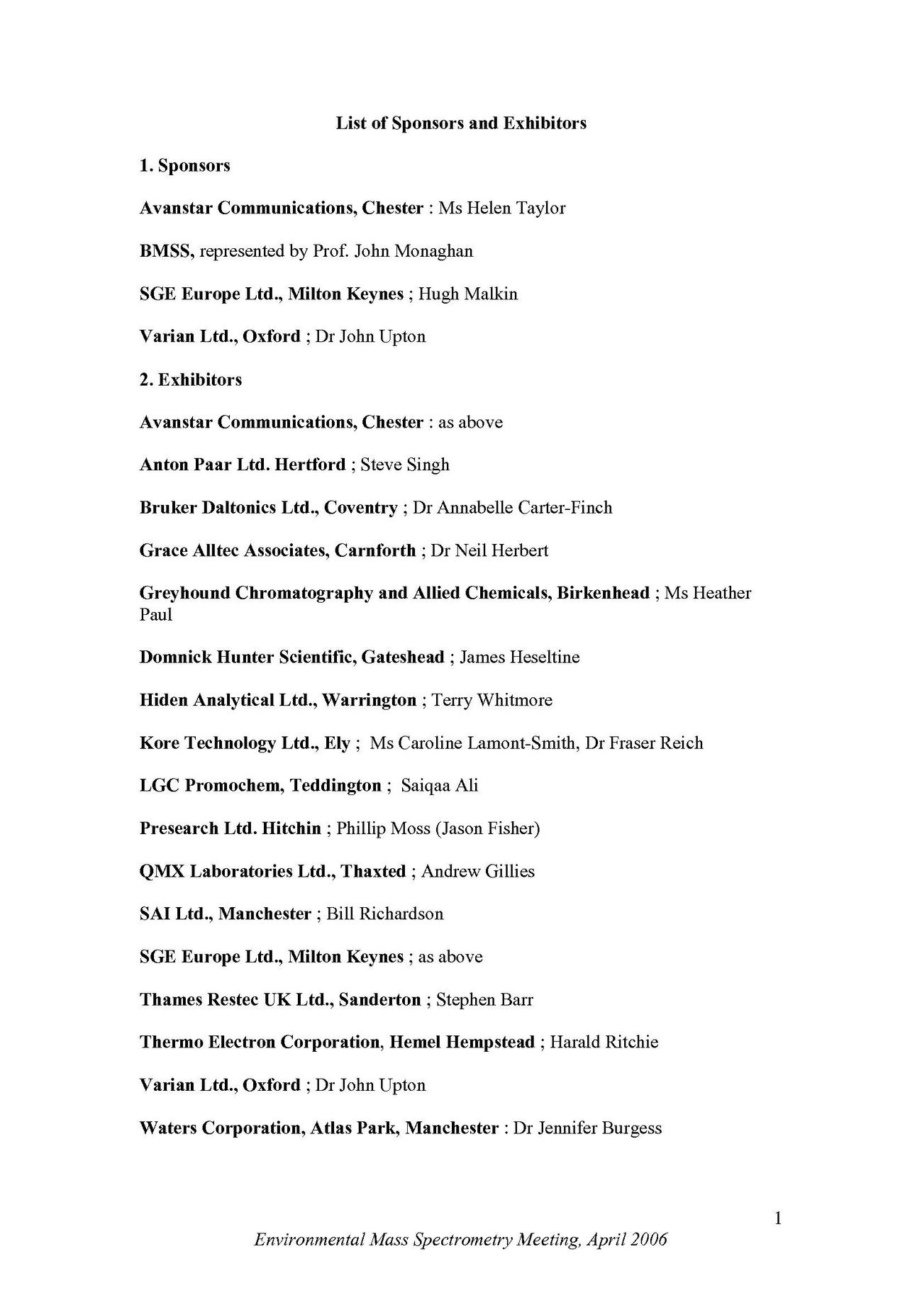 Advanstar, Anton Parr Ltd., Bruker Daltonics Ltd., Domnick Hunter Group, Grace (Alltech) Associates, Greyhound Chromatography & Allied Chemicals, Hiden Analytical Ltd., Kore Technology Ltd., Leco UK Ltd., LGC(Promochem), Presearch Ltd., Qmx Laboratories, SAI Ltd., SGE Europe Ltd., Thames Restec Ltd., Thermo Electron Corporation, Varian Ltd., Waters Corporation