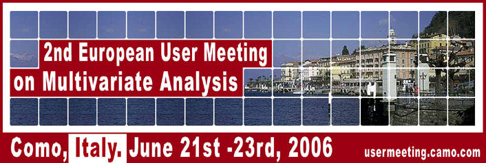 Abstract/Description: Camo is glad to announce the 2nd European User Meeting on Multivariate Data Analysis to take place in the beautiful surroundings of lake Como. Our ambition is to establish a forum for chemometricians at industrial level. We invite all The Unscrambler® users, professional scientists and everyone who is interested in multivariate data analysis to join this event to learn about the latest developments in the field, and exchange ideas and experiences.The conference will consist of key note speeches presented by some of the leading chemometricians, as well as contributed talks. Prior to the meeting, we also arrange a series of courses on topics related to multivariate analysis.