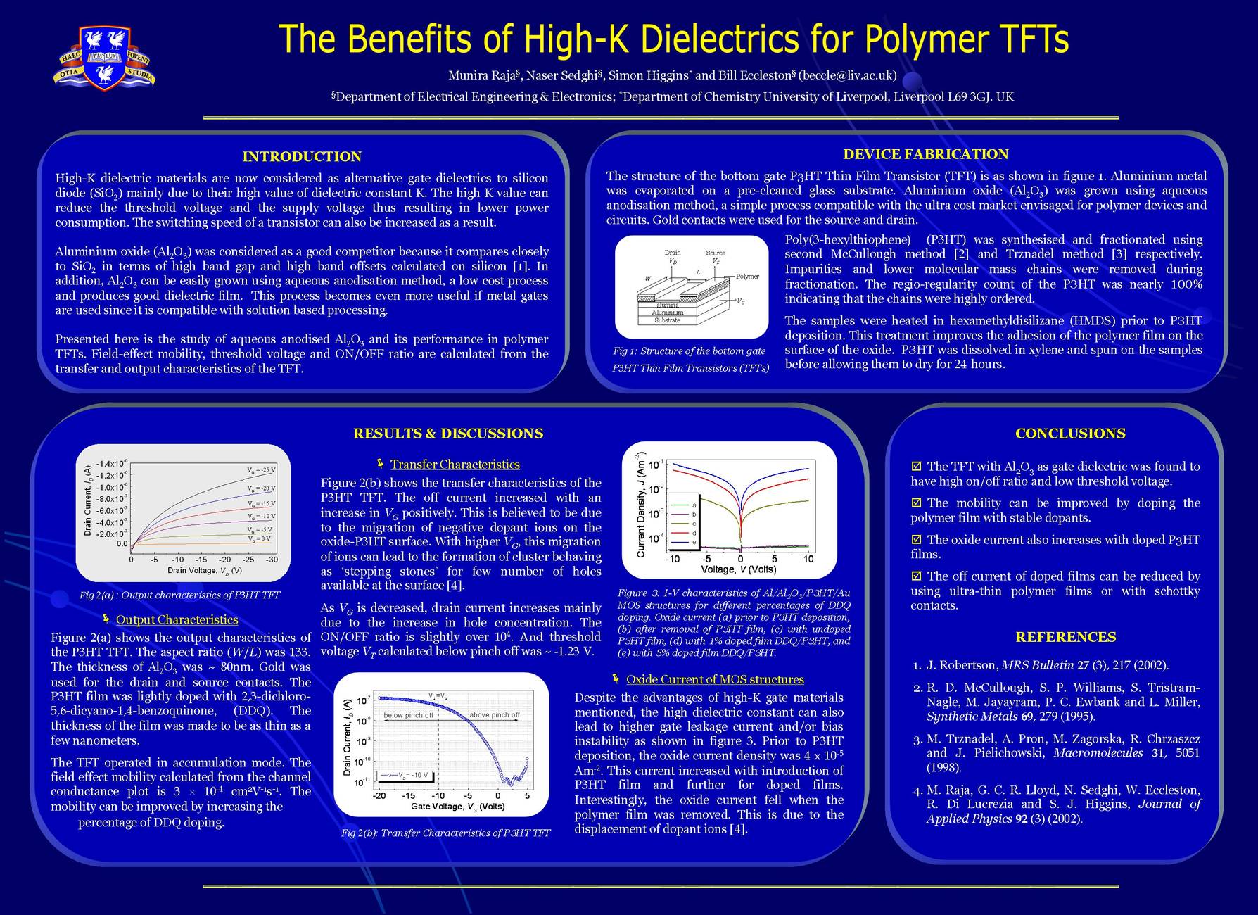 Abstract/Description: High-K dielectric materials are now considered as alternative gate dielectrics to silicon diode (SiO2) mainly due to their high value of dielectric constant K. The high K value can reduce the threshold voltage and the supply voltage thus resulting in lower power consumption. The switching speed of a transistor can also be increased as a result.