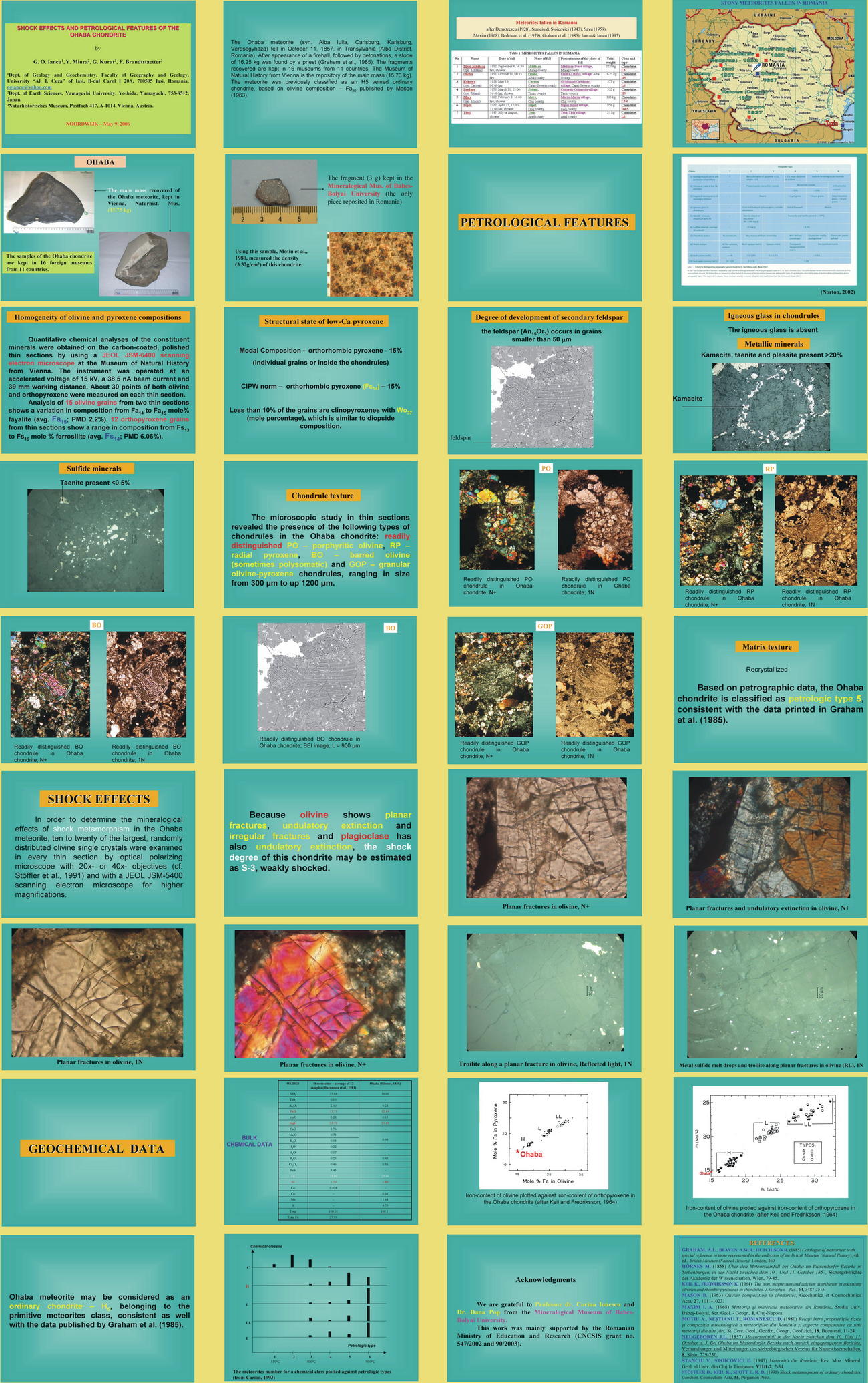 Abstract/Description: The Ohaba meteorite fell in October 11, 1857, in Transylvania (Alba District, Romania). After appearance of a fireball, followed by detonations, a stone of 16.25 kg was found by a priest (Graham et al., 1985). The fragments recovered are kept in 16 museums from 11 countries. The Museum of Natural History from Vienna is the repository of the main mass (15.73 kg). The meteorite was previously classified as an H5 veined ordinary chondrite, based on olivine composition â€" Fa20 published by Mason (1963).