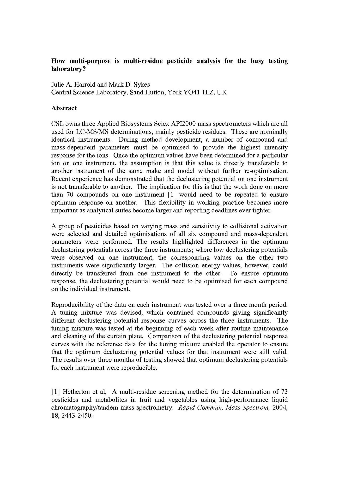 Abstract/Description: CSL owns three Applied Biosystems Sciex API2000 mass spectrometers which are all used for LC-MS/MS determinations, mainly pesticide residues. These are nominally identical instruments. During method development, a number of compound and mass-dependent parameters must be optimised to provide the highest intensity response for the ions. Once the optimum values have been determined for a particular ion on one instrument, the assumption is that this value is directly transferable to another instrument of the same make and model without further re-optimisation. Recent experience has demonstrated that the declustering potential on one instrument is not transferable to another. The implication for this is that the work done on more than 70 compounds on one instrument [1] would need to be repeated to ensure optimum response on another. This flexibility in working practice becomes more important as analytical suites become larger and reporting deadlines ever tighter.