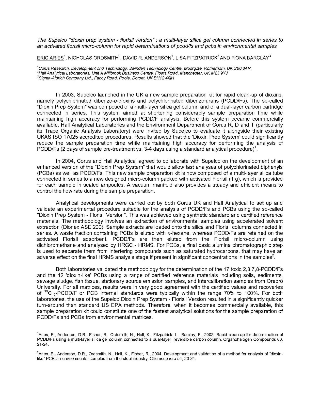 Abstract/Description: In 2003, Supelco launched in the UK a new sample preparation kit for rapid clean-up of dioxins, namely polychlorinated dibenzo-p-dioxins and polychlorinated dibenzofurans (PCDD/Fs). The so-called “Dioxin Prep System” was composed of a multi-layer silica gel column and of a dual-layer carbon cartridge connected in series. This system aimed at shortening considerably sample preparation time while maintaining high accuracy for performing PCDD/F analysis. Before this system became commercially available, Hall Analytical Laboratories and the Environment Department of Corus R, D and T (particularly its Trace Organic Analysis Laboratory) were invited by Supelco to evaluate it alongside their existing UKAS ISO 17025 accredited procedures. Results showed that the 'Dioxin Prep System' could significantly reduce the sample preparation time while maintaining high accuracy for performing the analysis of PCDD/Fs (2 days of sample pre-treatment vs. 3-4 days using a standard analytical procedure.