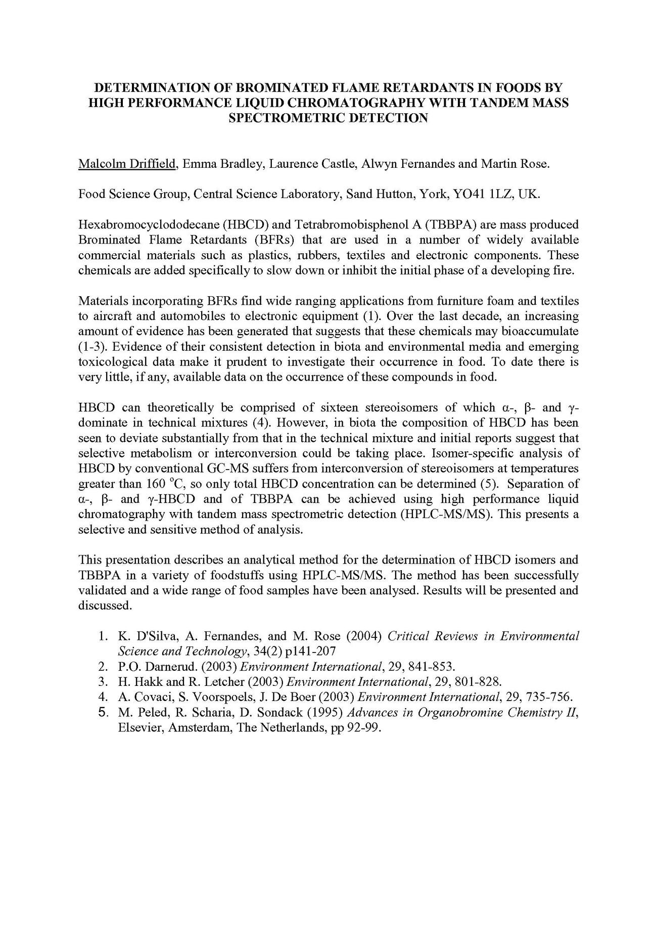 Abstract/Description: Hexabromocyclododecane (HBCD) and Tetrabromobisphenol A (TBBPA) are mass produced Brominated Flame Retardants (BFRs) that are used in a number of widely available commercial materials such as plastics, rubbers, textiles and electronic components. These chemicals are added specifically to slow down or inhibit the initial phase of a developing fire.