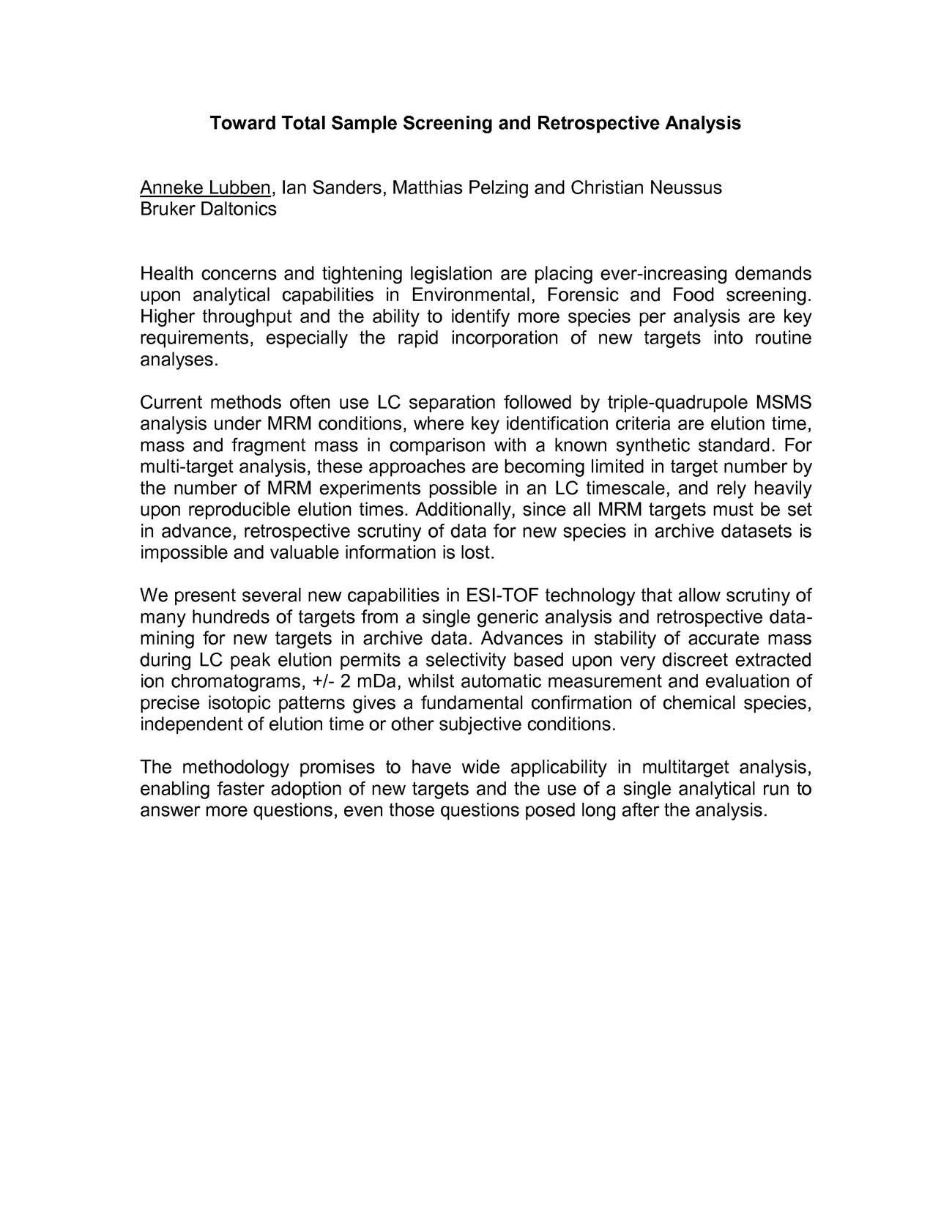 Abstract/Description: Health concerns and tightening legislation are placing ever-increasing demands upon analytical capabilities in Environmental, Forensic and Food screening. Higher throughput and the ability to identify more species per analysis are key requirements, especially the rapid incorporation of new targets into routine analyses.