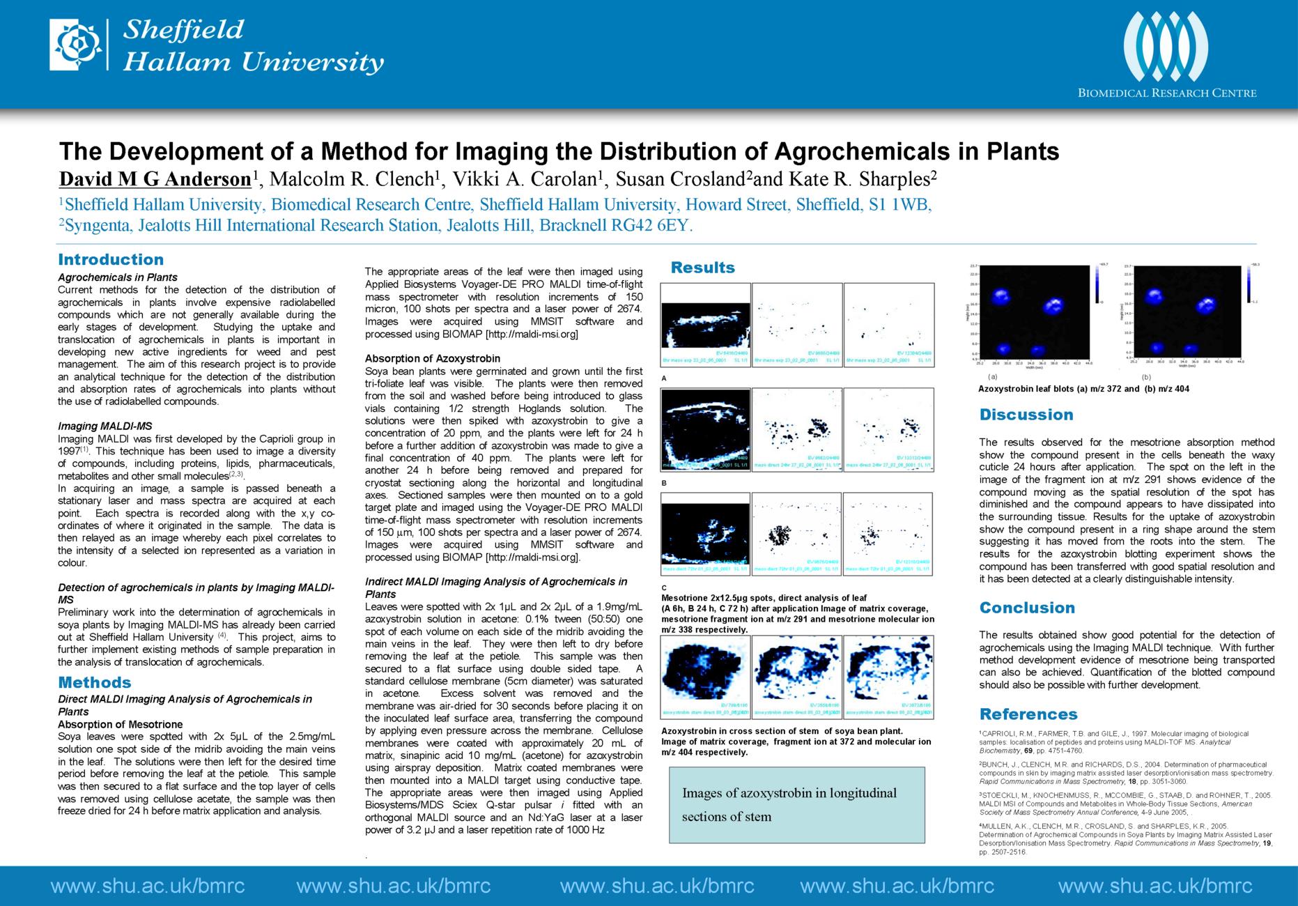 Abstract/Description: The development of a method for imaging the distribution of mesotrione and azoxystrobin in the plant after foliar uptake is described. MALDI-TOF-MS images have been obtained using an Applied Biosystems/MDS Sciex Q-star pulsar i fitted with an orthogonal MALDI source and an Nd:YaG laser. Solutions of agrochemicals were applied to leaves, incubated at room temperature to allow absorption into the leaf, and translocation of compounds into the stem. Images of the deprotonated and protonated molecules have been generated, that indicate the distribution of the compound in the plant.